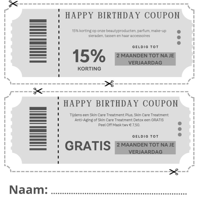 Voorwaarden: deze coupons zijn tot 2 maanden ná uw verjaardag geldig. Print ze uit en vul uw naam in. Indien u deze ingevulde coupons niet meeneemt naar uw afspraak, dan kan er helaas geen korting gegeven worden.
